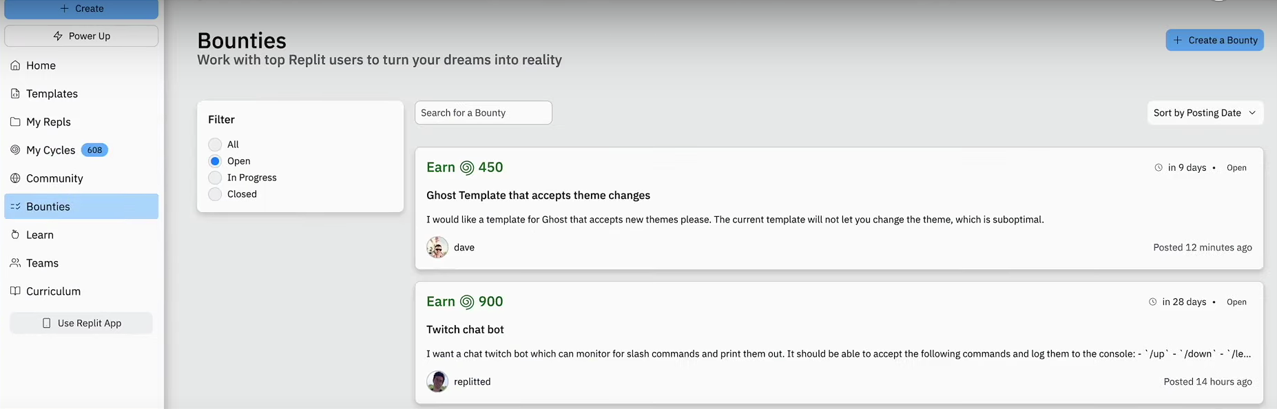Earn Cycles by completing Bounties, real coding challenges posted by other users, or buy them directly.
